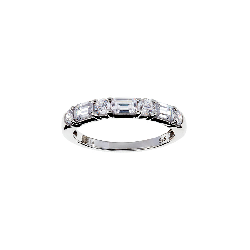 Rhodium plated 925 sterling silver with baguette and round claw set clear cubic zirconias